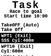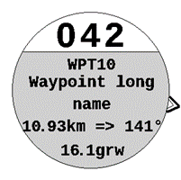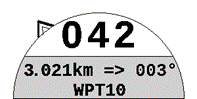 Informace o WP (waypointu) : ultimátní nástroj pro sledování navigační trasy a dosažení dalšího bodu v optimálním čase. Jakmile je trasa nahraná, získáte na této položce: jméno další značky, vzdálenost k ní, trasu k tomu, jak tangenciálně projet rádius značky a vaši aktuální trasu. Na příkladu vpravo se další značka jmenuje „WPT10“, nachází se 3021 m od vaší pozice, musíte vzít kurz 003° doleva, protože momentálně letíte na 042°. Graf vám pomůže získat správný směr. Černá šipka ukazuje trasu pro tangenciální průlet značky (optimalizovaná trasa) a bílá šipka pro směr do středu značky.