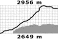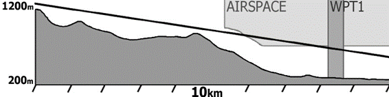 Asistent přechodu : je to řez směru sledované trasy po zemi (který se může lišit od vašeho kurzu v závislosti na větru). Najdete tam reliéf, značky a vzdušné prostory. Horizontální měřítko je možné upravit během letu.