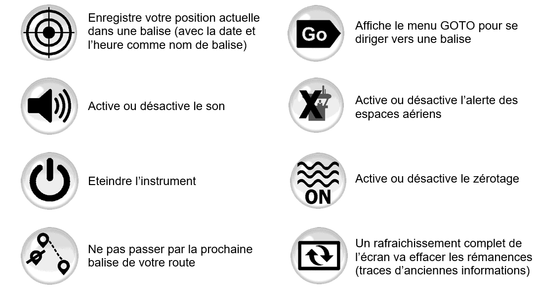 Kluznost k cíli : označeno „GRG“ pro „Glide Ratio Goal“, udává vám kluzavost potřebnou k dosažení cíle (přechodem optimalizovaných bodů předchozích značek, je-li to nutné). Pozor, vítr může zhoršit vaši kluznost vůči zemi a zabránit vám dorazit do cíle ve požadované výšce.