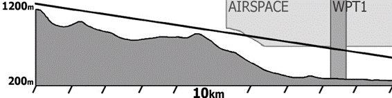 Transition-Assistent : das ist eine Querschnittsansicht der Richtung, der Sie am Boden folgen (die je nach Wind vom Kurs abweichen kann). Sie finden dort Gelände, Wendepunkte und Lufträume. Die horizontale Skala ist während des Fluges anpassbar.