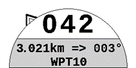 Wegpunkt-Information : ultimatives Werkzeug, um einer Navigationsroute zu folgen und die nächste Wendemarke in optimaler Zeit zu erreichen. Sobald eine Route geladen ist, erhalten Sie in diesem Element: den Namen der nächsten Wendemarke, die Entfernung zu ihr, die zu folgende Route, um den Wendekreis zu tangieren, und Ihren aktuellen Kurs. Im Beispiel rechts heißt die nächste Wendemarke „WPT10“, sie befindet sich 3021 m von Ihrer Position entfernt, Sie müssen einen Kurs von 003° nach links nehmen, da Sie derzeit mit 042° fliegen. Das Diagramm hilft Ihnen, die richtige Richtung zu finden. Der schwarze Pfeil zeigt die Route zum Tangieren der Wendemarke (optimierte Route) und der weiße Pfeil zeigt zum Zentrum der Wendemarke.