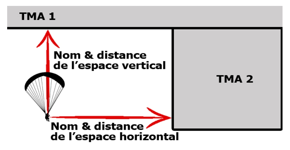Lufträume : das Bild unten zeigt die verschiedenen Elemente, die Ihre Position in Bezug auf Lufträume angeben. Die Referenzhöhe für Abstandberechnungen basiert auf Ihrer Druckhöhe (QNH).