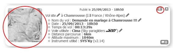 erscheint im Menü « Einstellungen / Flugbuch » zeigt an, dass der aktuell angezeigte Flug erfolgreich auf die Syride-Website übertragen wurde.