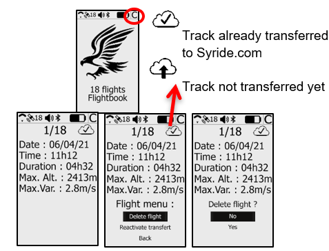 1. 画面Cにいるときに中央ボタンを押すと、機器のメモリに保存されたフライトのデータを確認したり、トラックを削除したり、必要に応じて再転送するためにフライトを「未転送」にマークしたりできます。